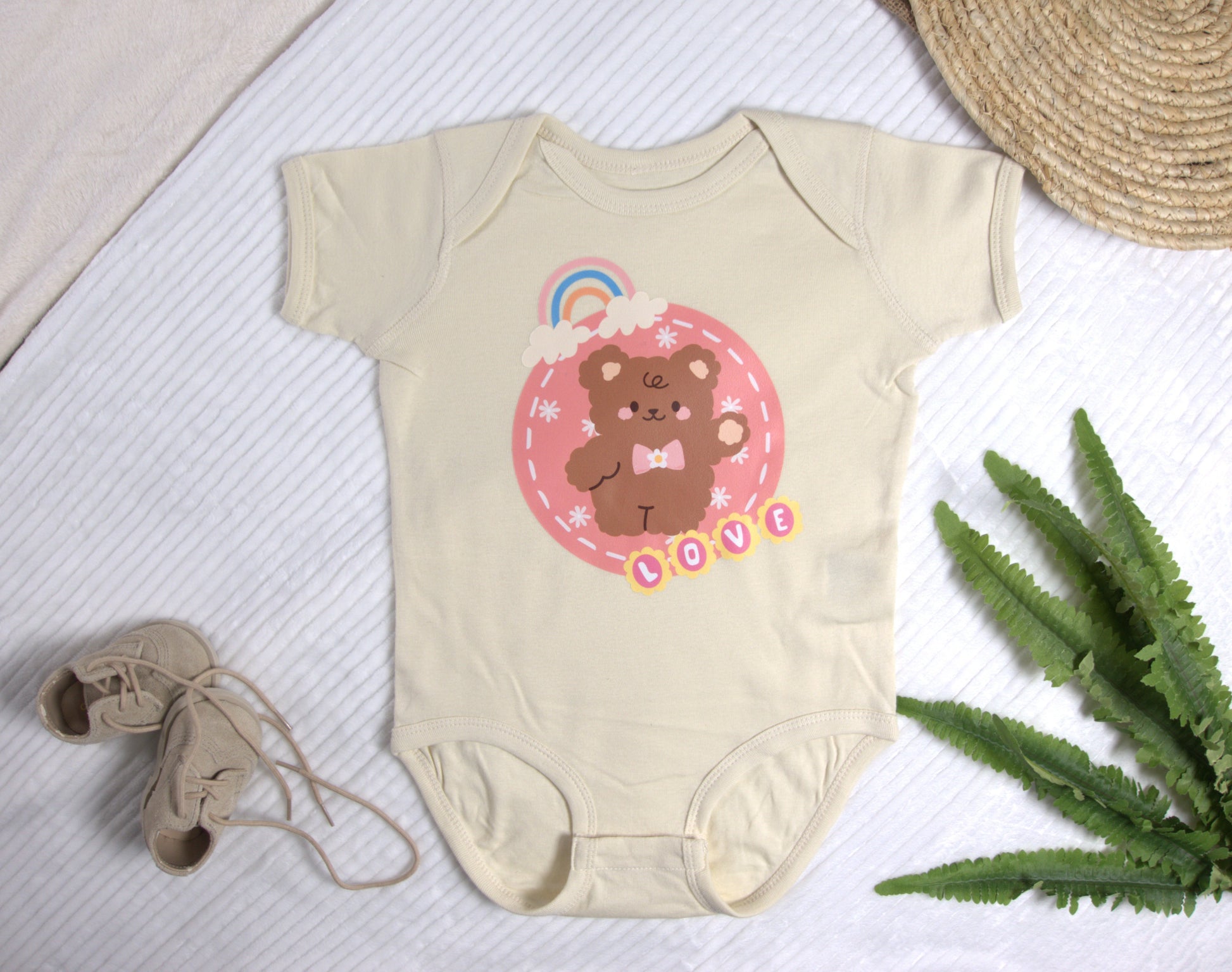 This onesie features a pastel-colored adorable bear design that will have everyone melting over your baby's cuteness. The soft, breathable cotton fabric will keep your little one comfortable all day long. Available in a range of sizes to grow with your child, the convenient snap closure allows for simple, hassle-free diaper changes.