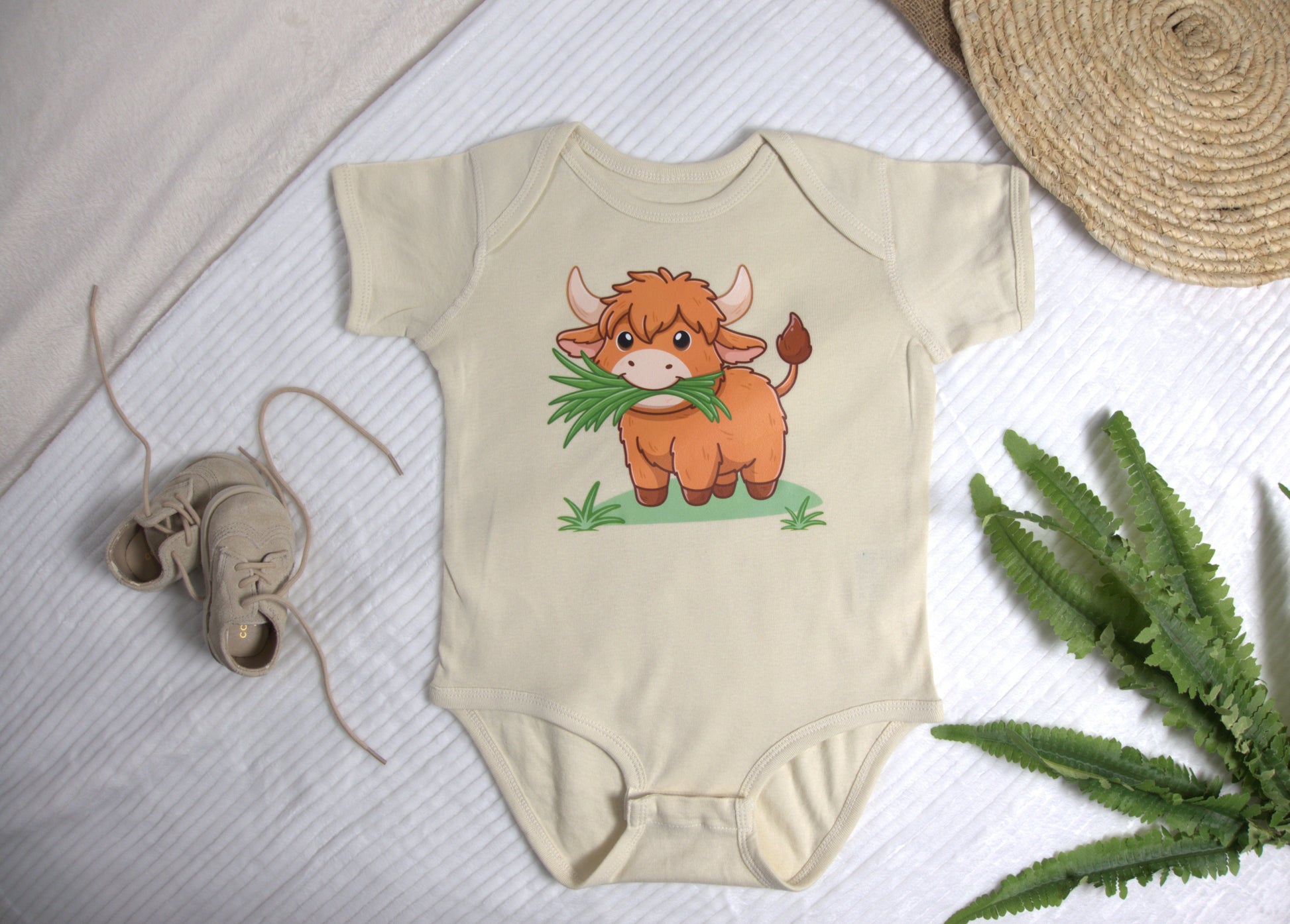 Introducing our adorable Hungry Milo onesie! Perfect for little ones who love cute animals, this onesie features a charming design of a fluffy highland cow munching on grass.