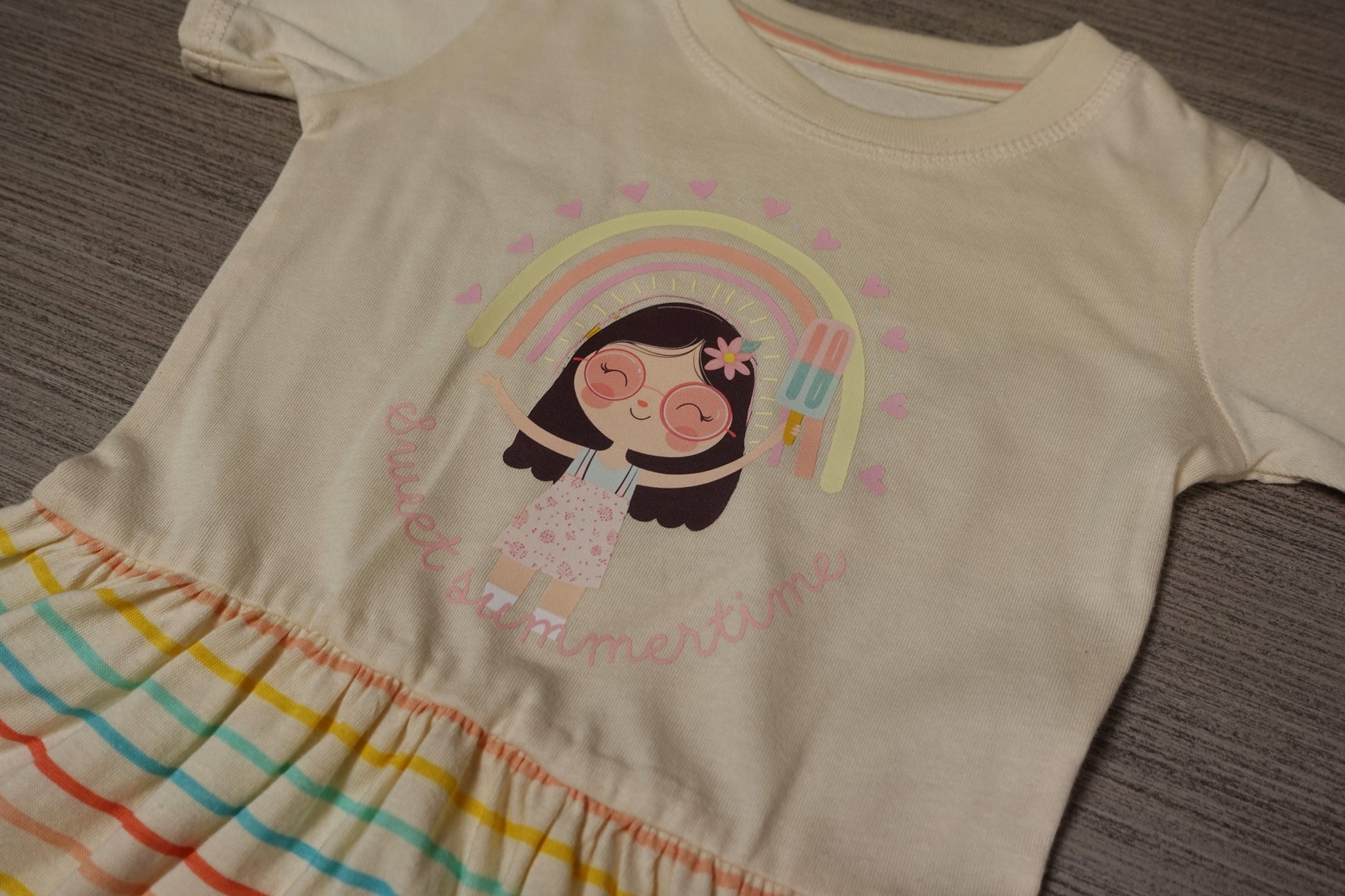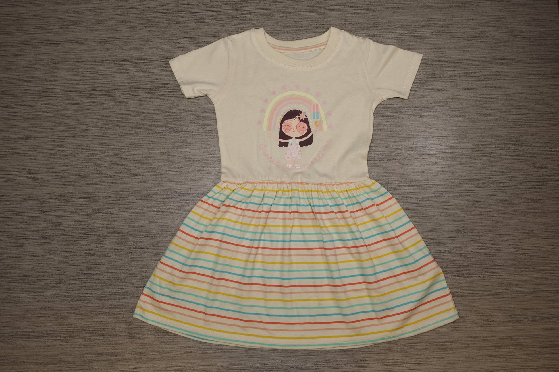 Brighten up your little one's summer wardrobe with our adorable baby girl's jersey dress featuring a cheerful rainbow design! Perfect for playdates, picnics, or just twirling around the backyard, this dress is a must-have for sunny days. Dress her up in this delightful piece and watch her shine like the rainbow she is!